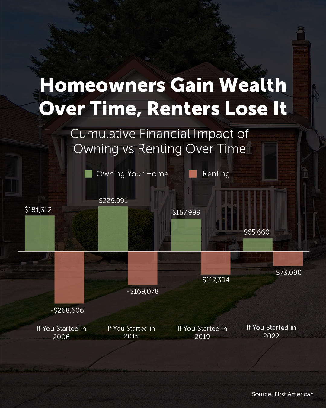 This chart makes it clear. No matter when someone buys, homeowners end up building far more wealth than renters. And that’s true even after you factor in things like repairs and property taxes.
